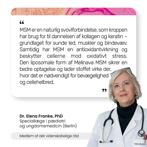 Takket være sine antioxidative egenskaber kan MSM bidrage til kroppens naturlige reparationsprocesser og styrke forsvaret mod skadelige påvirkninger. Giver dig en følelse af vitalitet, balance og indre styrkehver dag.